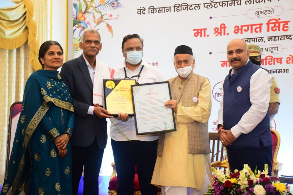 मुंबईतील राजभवन येथे राज्यपाल भगतसिंह कोश्यारी यांच्या हस्ते वंदे किसान कृषी सन्मान पुरस्कार स्वीकारताना मुक्त विद्यापीठाचे सेवानिवृत्त कृषी शिक्षण संचालक डाॅ. सूर्या गुंजाळ. समवेत माजी शालेय शिक्षणमंत्री आशिष शेलार, प्रसाद कुलकर्णी.