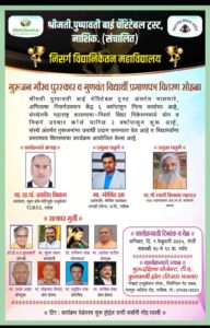 श्रीमती पुष्पावतीबाई चॅरिटेबल ट्रस्टचे निसर्ग विद्यानिकेतन महाविद्यालय व अभिलाषा निसर्गोपचार केंद्रातर्फे गुरूजनांना उपाधी प्रदान व विद्यार्थ्यांना प्रमाणपत्र वितरणाचा कार्यक्रम शनिवारी (दि.1) होणार आहे. सकाळी 10 ते दुपारी बारा वाजेदरम्यान गुरूदक्षिणा प्रोजेक्ट, टी. ए. कुलकर्णी हाॅल (तिसरा मजला) येथे हा कार्यक्रम होईल.