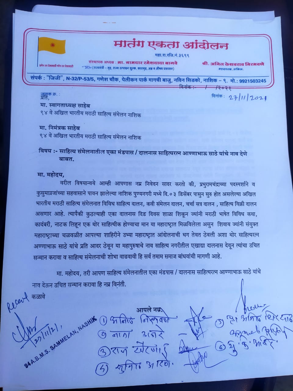 निवेदनाचा आशय असा : प्रभू रामचंद्राचा पदस्पर्श व कवी कुसुमाग्रजांच्या सहवासाने पावन झालेल्या नाशिक पुण्यनगरी ०३ डिसेंबरपासून साहित्य संमेलन सुरु होत आहे. या संमेलनात विविध साहित्य दालन, कवी संमेलन दालन, चर्चासत्र दालन, साहित्य विक्री दालन असणार आहे. त्यापैकी कुठल्याही एका दालनास अण्णाभाऊ साठे यांचे नाव द्यावे. साठे यांनी दीड दिवस शाळा शिकून मराठी भाषेत विविध कथा, कादंबरी, नाटक लिहून एक थोर साहित्यिक होण्याचा मान या महाराष्ट्रात मिळविलेला आहे. शिवाय त्यांनी संयुक्त महाराष्ट्राच्या चळवळीत आपल्या शाहिरीने उभ्या महाराष्ट्रात आंदोलनाची धग तेवत ठेवली. असे थोर साहित्यरत्न अण्णाभाऊ साठे यांच्याविषयी आदर ठेवून या महापुरुषाचे नाव साहित्यनगरीतील एखाद्या दालनास द्यावे. त्यांचा हा उचित सन्मान करावा आणि साहित्य संमेलनाची शोभा वाढवावी, ही सर्व समाज बांधवांची मागणी आहे.